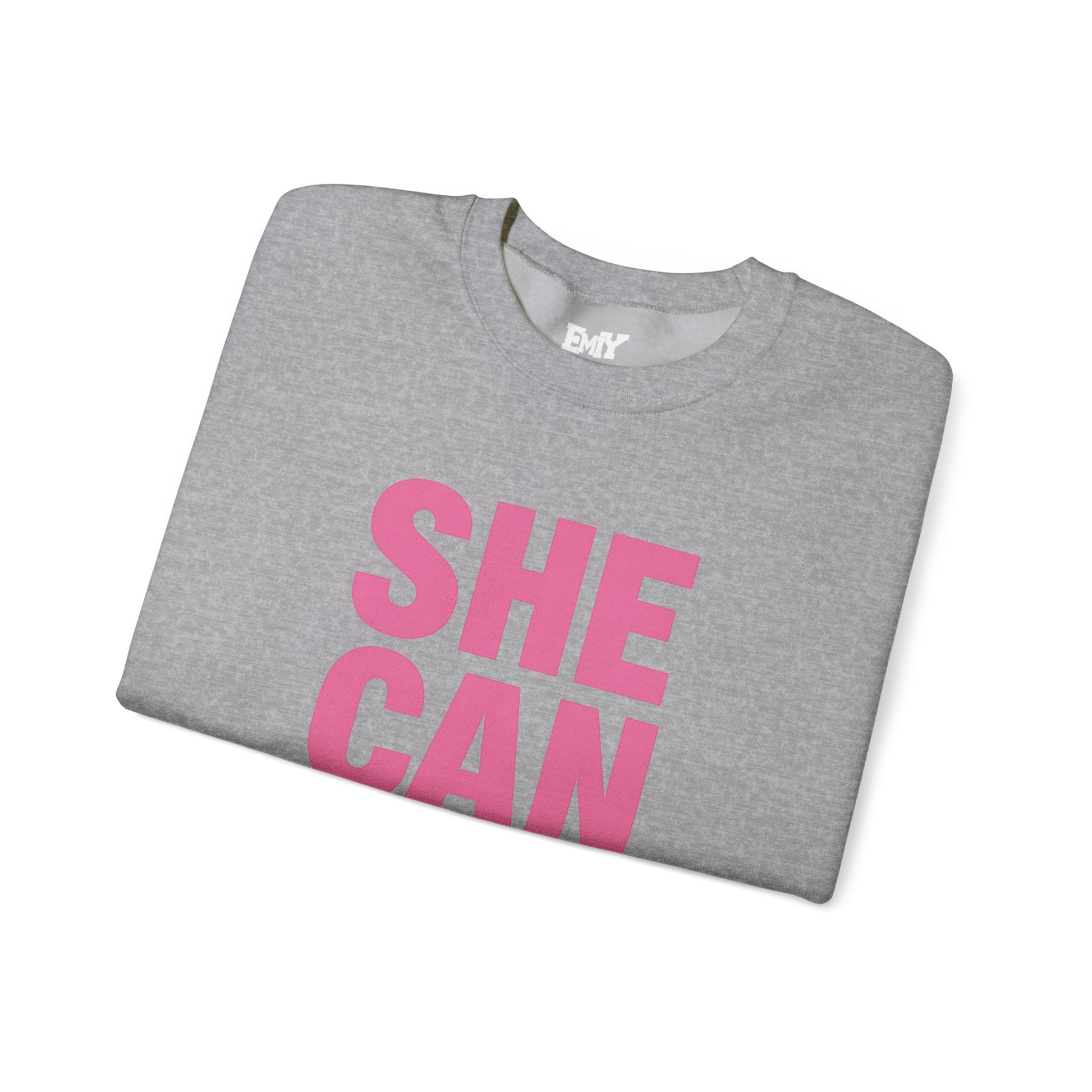 Empowering Unisex Crewneck Sweatshirt featuring the message 'She Can Too'. This inspirational and motivational apparel is perfect for casual wear and everyday comfort. It sends a powerful message to unite women and is relevant to those seeking empowerment and positivity. Ideal for gifting during Women's History Month, International Women's Day, or as a daily reminder of strength and resilience.